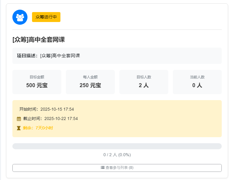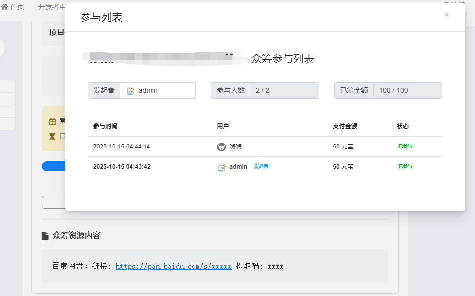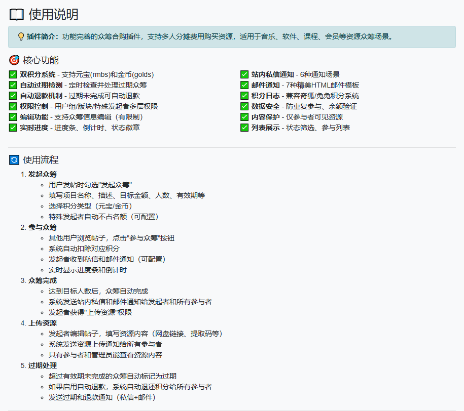 功能完善的众筹团购插件。支持多人分摊费用购买资源,双积分系统(元宝/金币),自动过期检测,自动退款,权限控制(用户组/版块/特殊发起者),完整通知系统(站内私信+邮件通知7种精美模板),实时进度展示,数据安全可靠。适用于音乐、软件、课程、会员等资源众筹场景。需预装积分插件和消息插件。